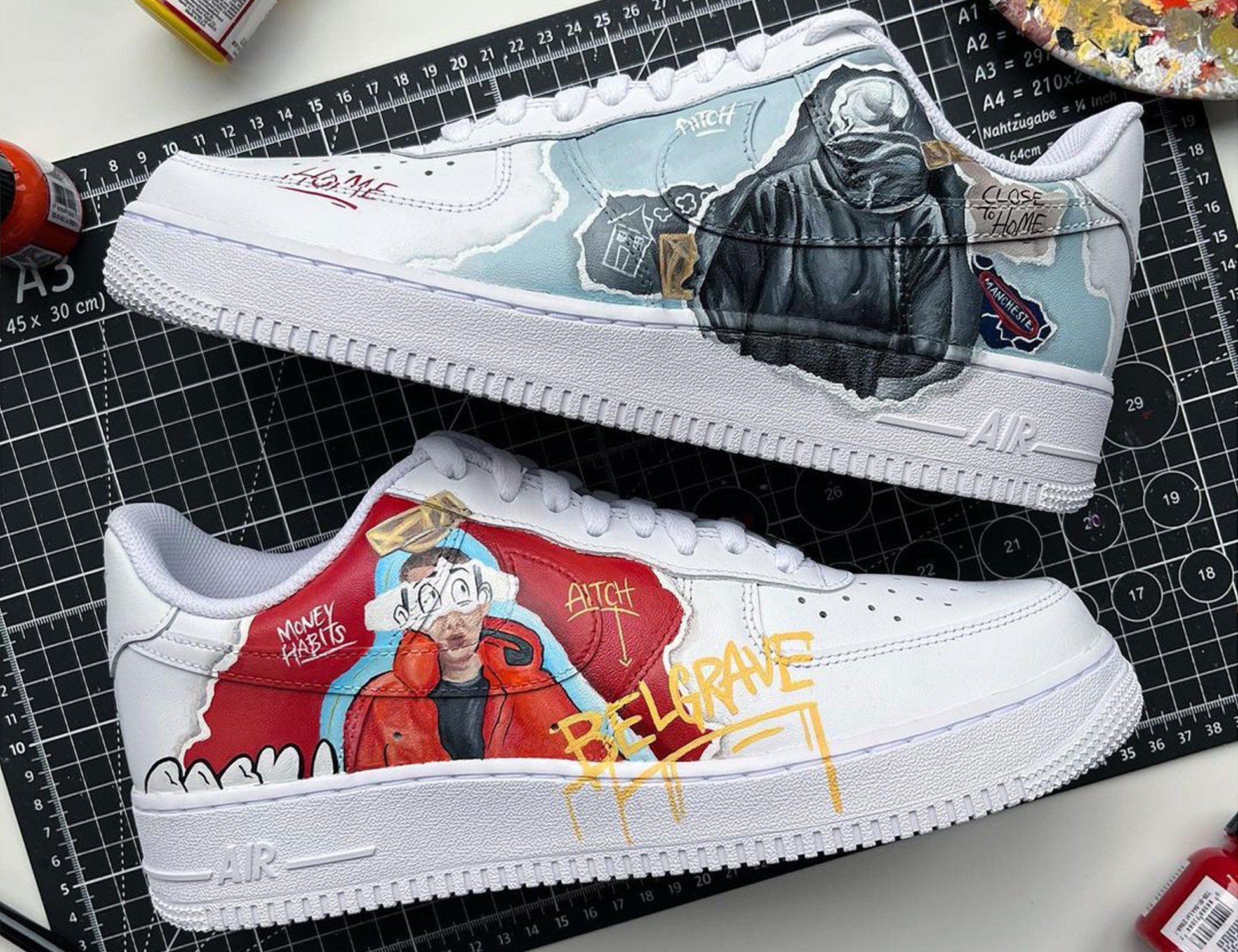 These sneakers feature intricate designs and eye-catching details, making them stand out from your standard shoe. Whether for special occasions or everyday wear, these customisations reflect the artists dedication to sneaker culture and their unique place within this art form.