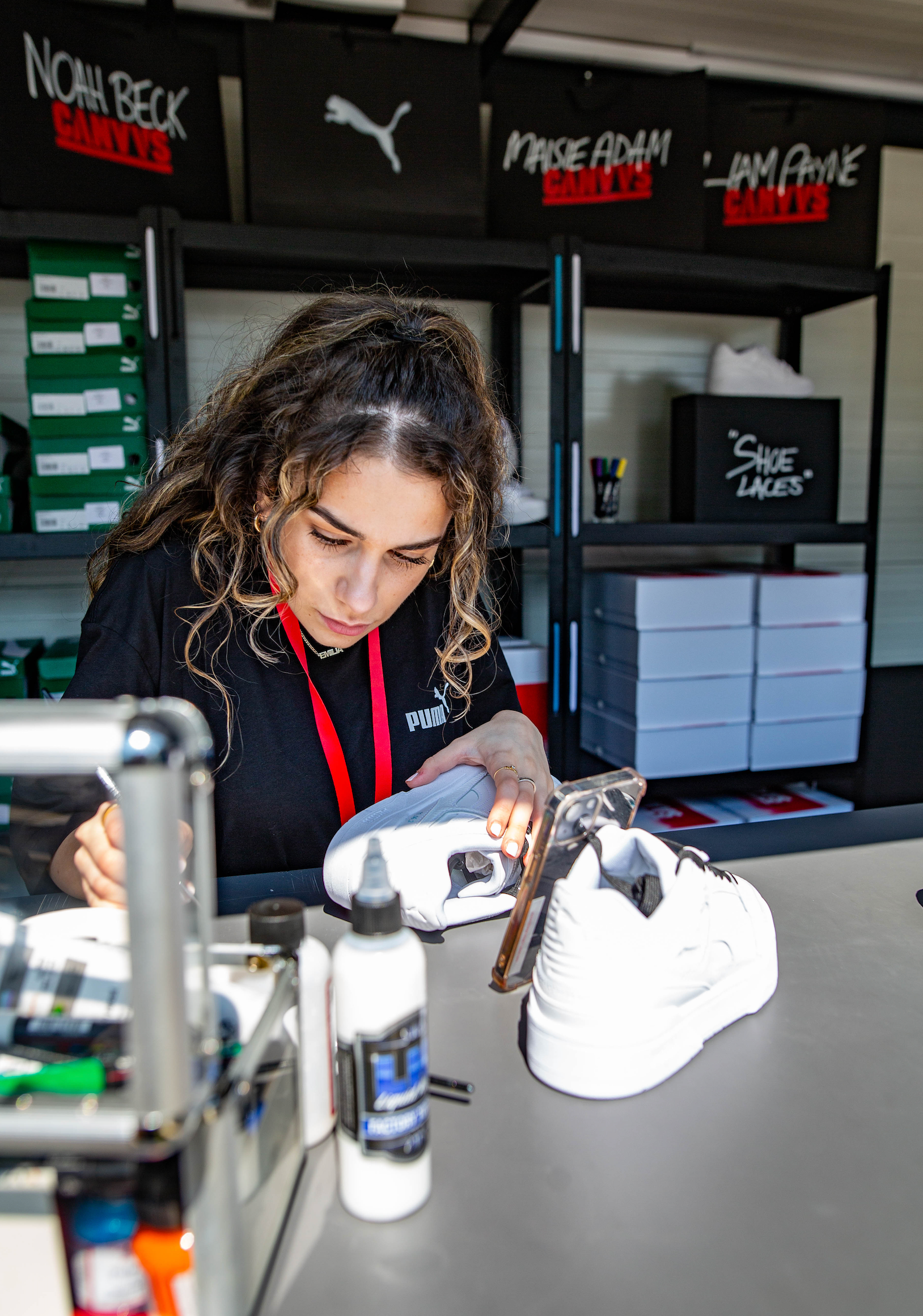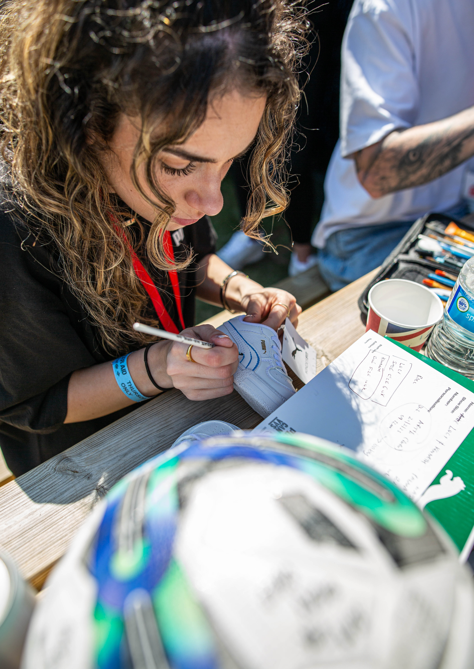 The Little customs joined us at the Soccer Aid training camp and match to hand paint personalised messages onto the the players PUMA Slipstreams as well as Danny Dyers 1 of 1 custom boots - highlighting his appreciation and love for his children and grandchildren.