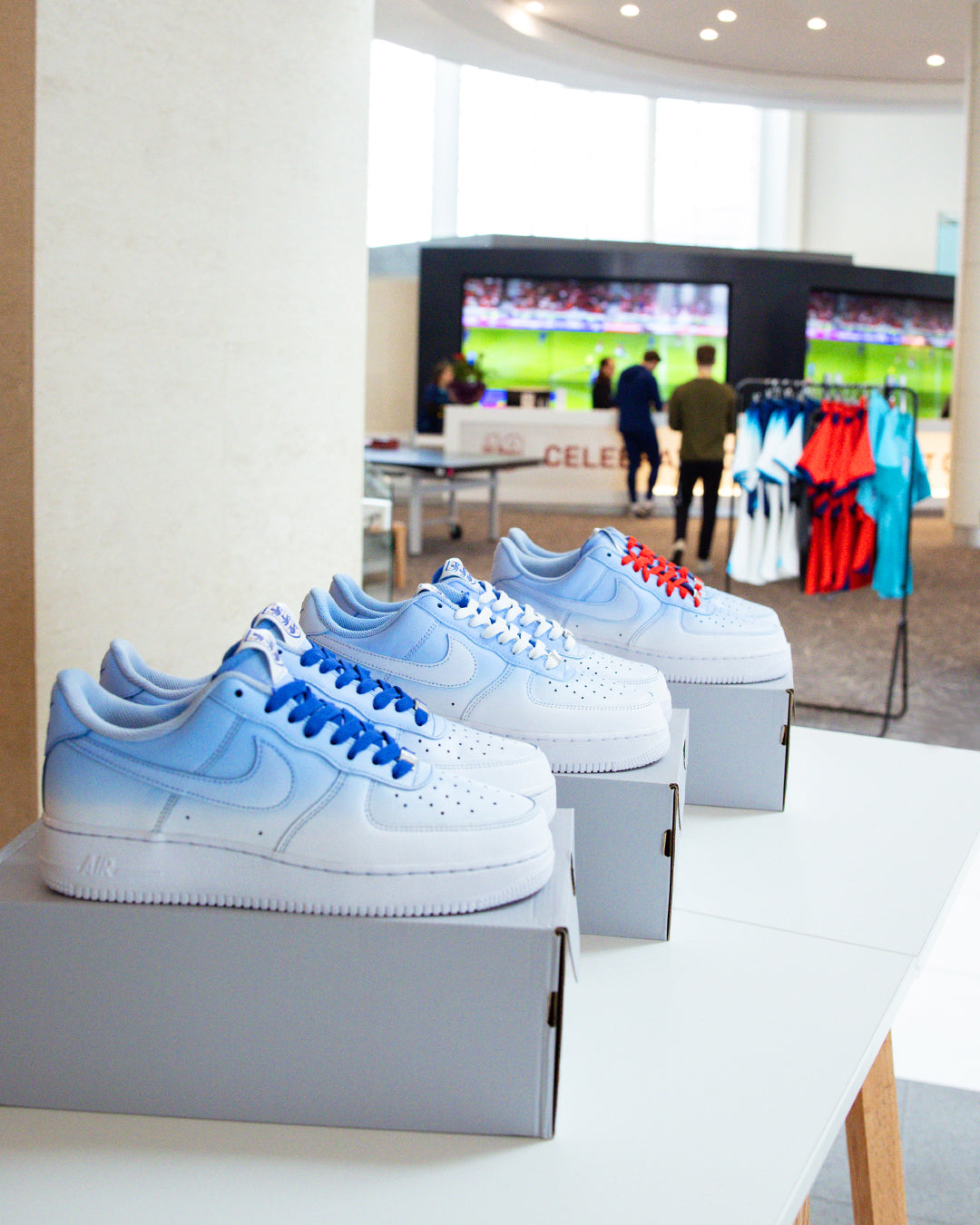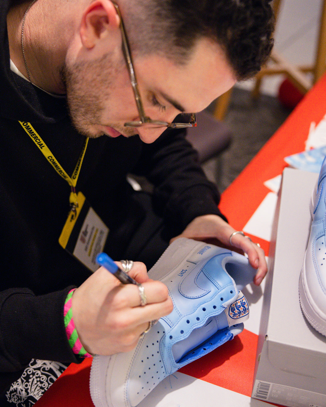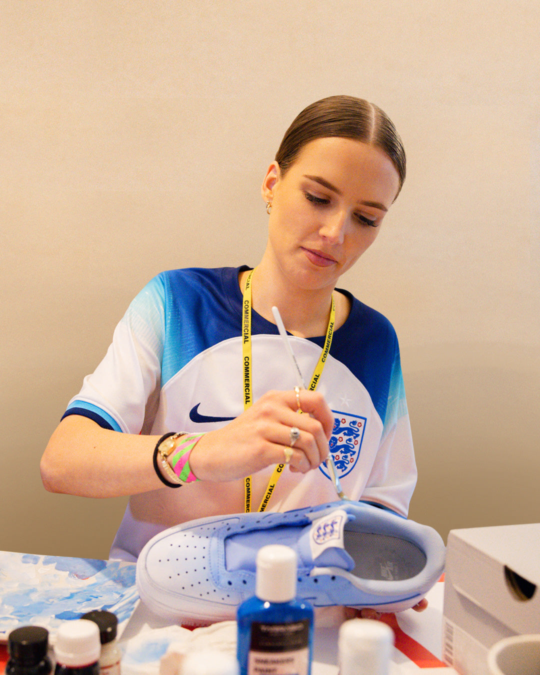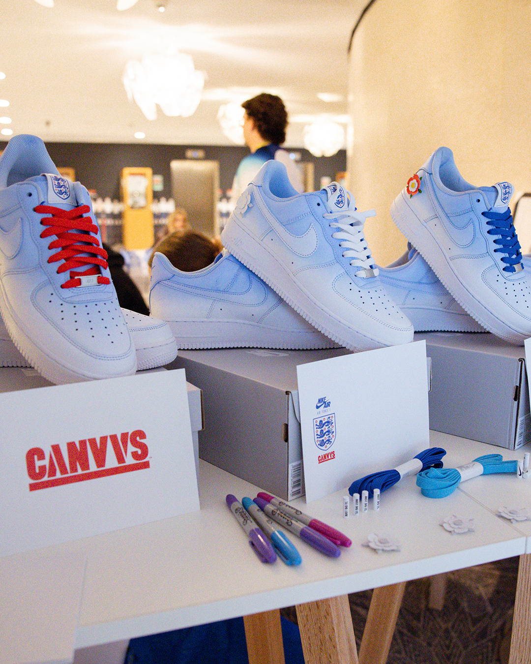 The day before the England squad flew off to Qatar, CANVVS hosted an activation at the historic St. George’s Park, giving the team a chance to create their own unique Air Force 1 to wear during the tournament. We had our three featured artists, plus our very own in house CANVVS artist in residence working on the shoes through the day, whilst players came over to start thinking about personalisations and additions for the base silhouette.