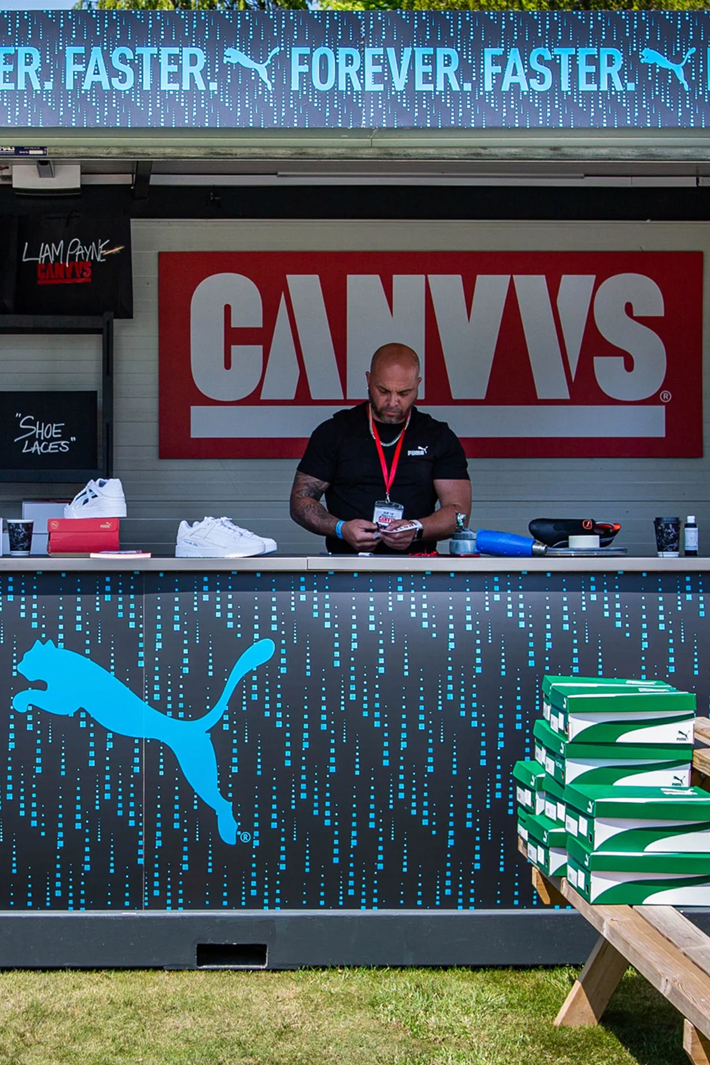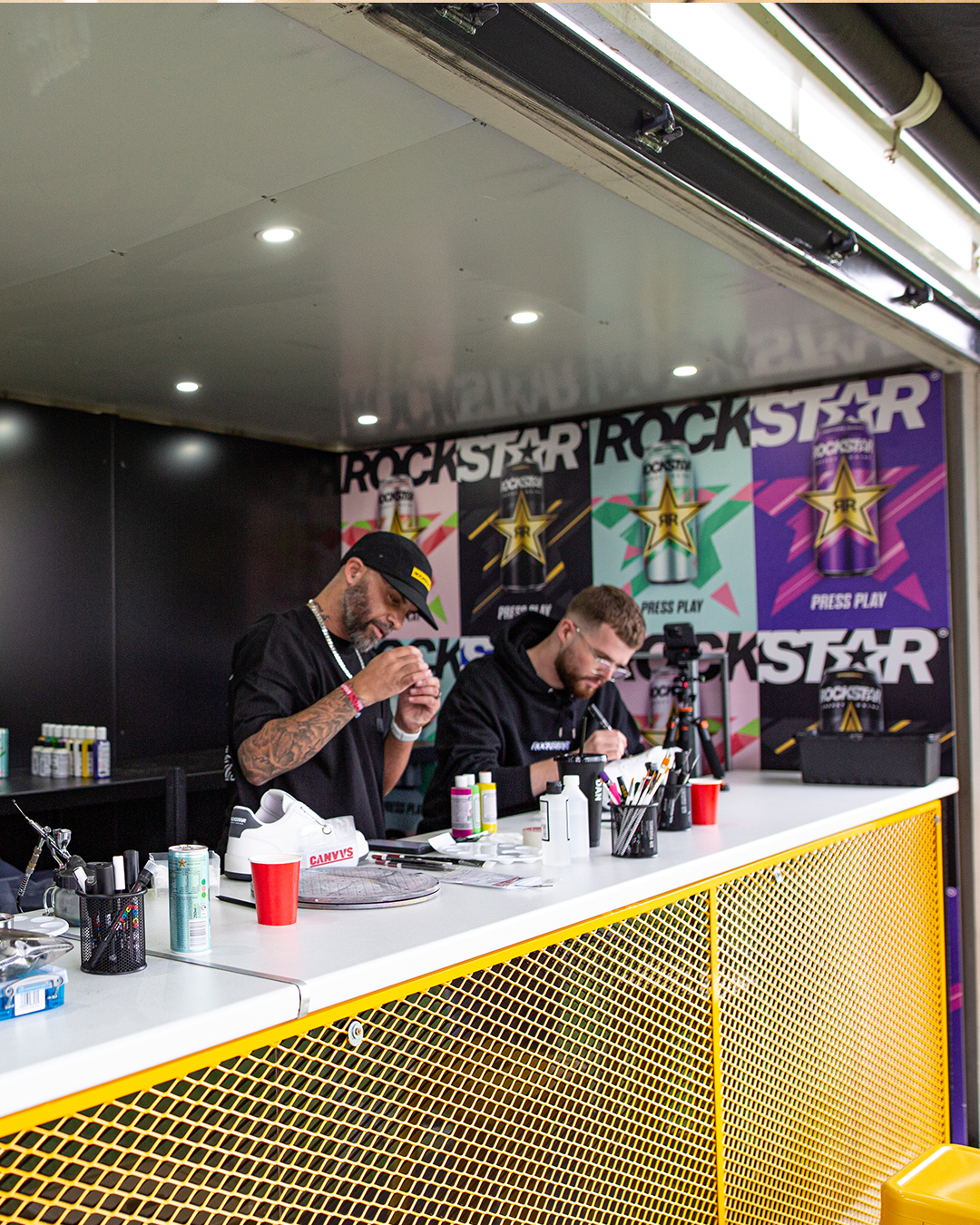 CANVVS delivered custom sneakers on-site for over 500 festival attendees and VIP artists using the CANVVS BL_NK silhouette. CANVVS artists worked across three days to hand paint and create 500 unique pairs of trainers for festival attendees.