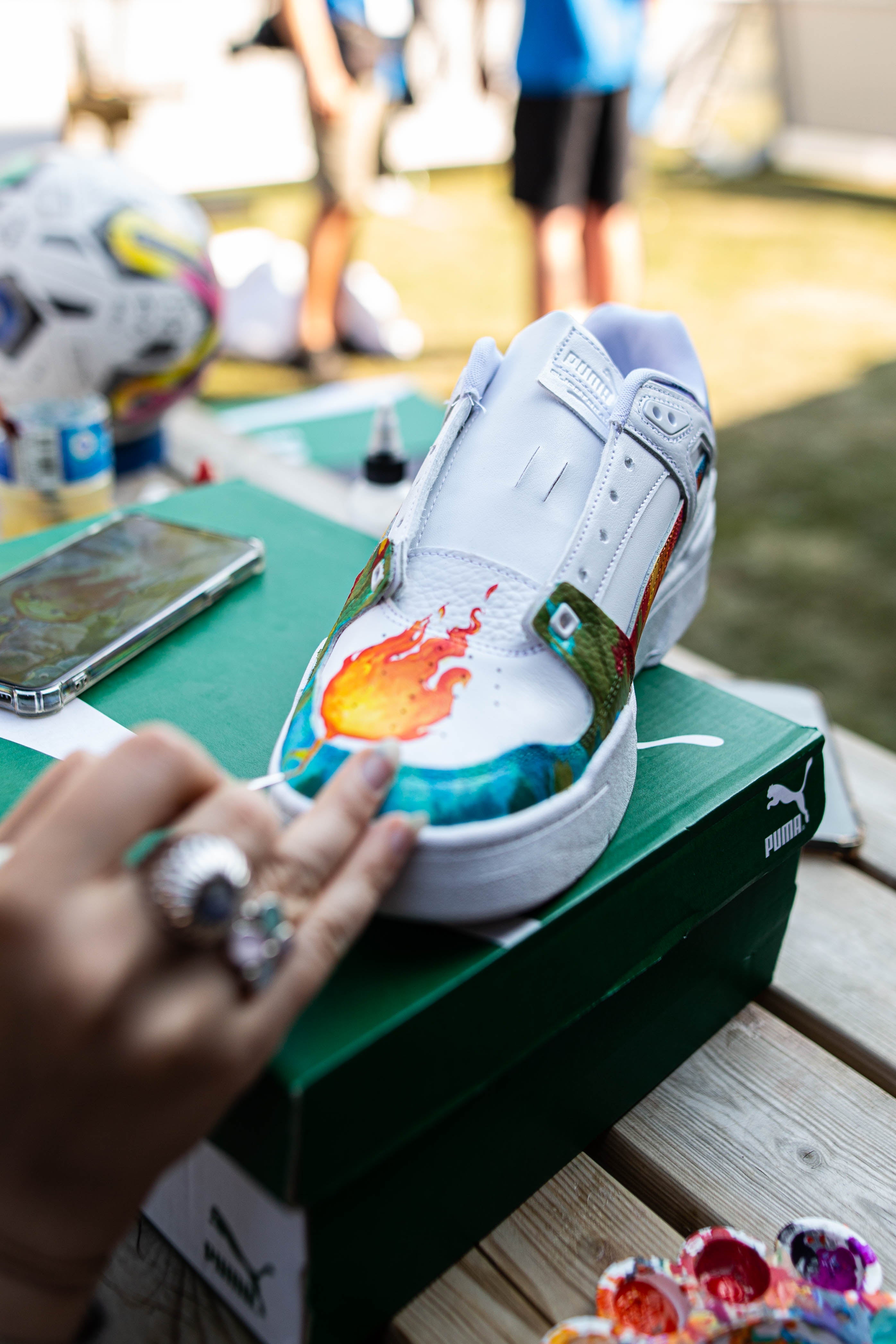 CANVVS teamed up with PUMA for Soccer Aid 2023 to create a collectable limited edition custom sneaker. Hosting an activation at the Soccer Aid training camp, CANVVS x Puma gave the team a chance to personalise their own unique Puma Slipstream. The 50 unique sneakers were presented to the Soccer Aid 2023 players and training staff at Old Trafford, the home of Manchester United, to a star-studded line-up of legendary footballers and entertainment icons.