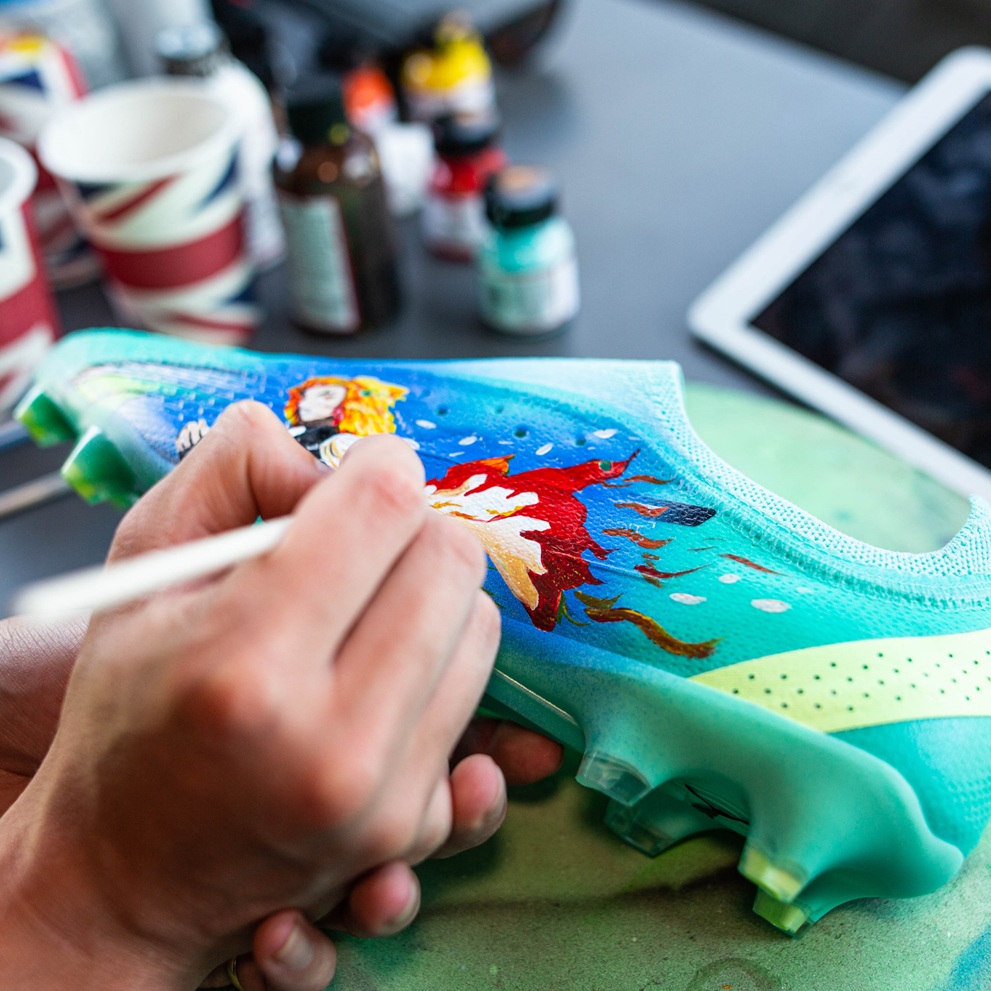 Our pop up was located next to the training pitch, which allowed for key visibility and ease of access for the players. The players visited the stand throughout the day, coming to see their sneakers and learn about the artists and CANVVS. Our artists had started on some inspirational sample pairs, relaying some of the stylistic choices the players could adapt and use. Dan Hayes set up in the stand, providing PUMA boot customisations for six chosen celebrities.