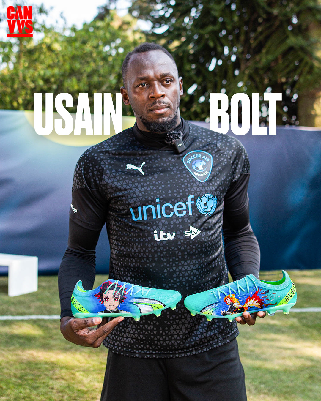 Usain Bolt is widely considered to be the greatest sprinter of all time, repping his 9.58 world record time on his Soccer Aid Jersey. The graphics are inspired by Usain's admiration for the manga series, and feature various characters from Demon Slayer.