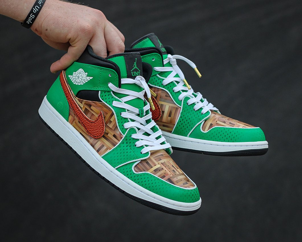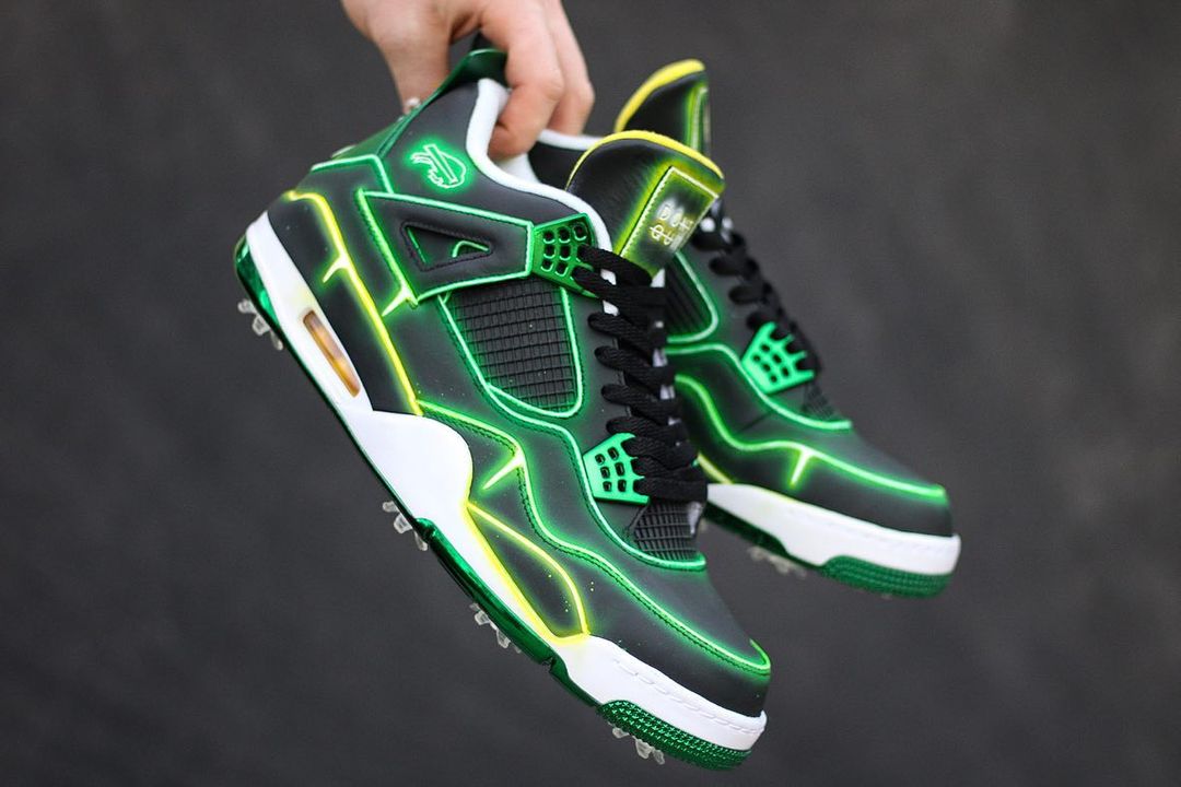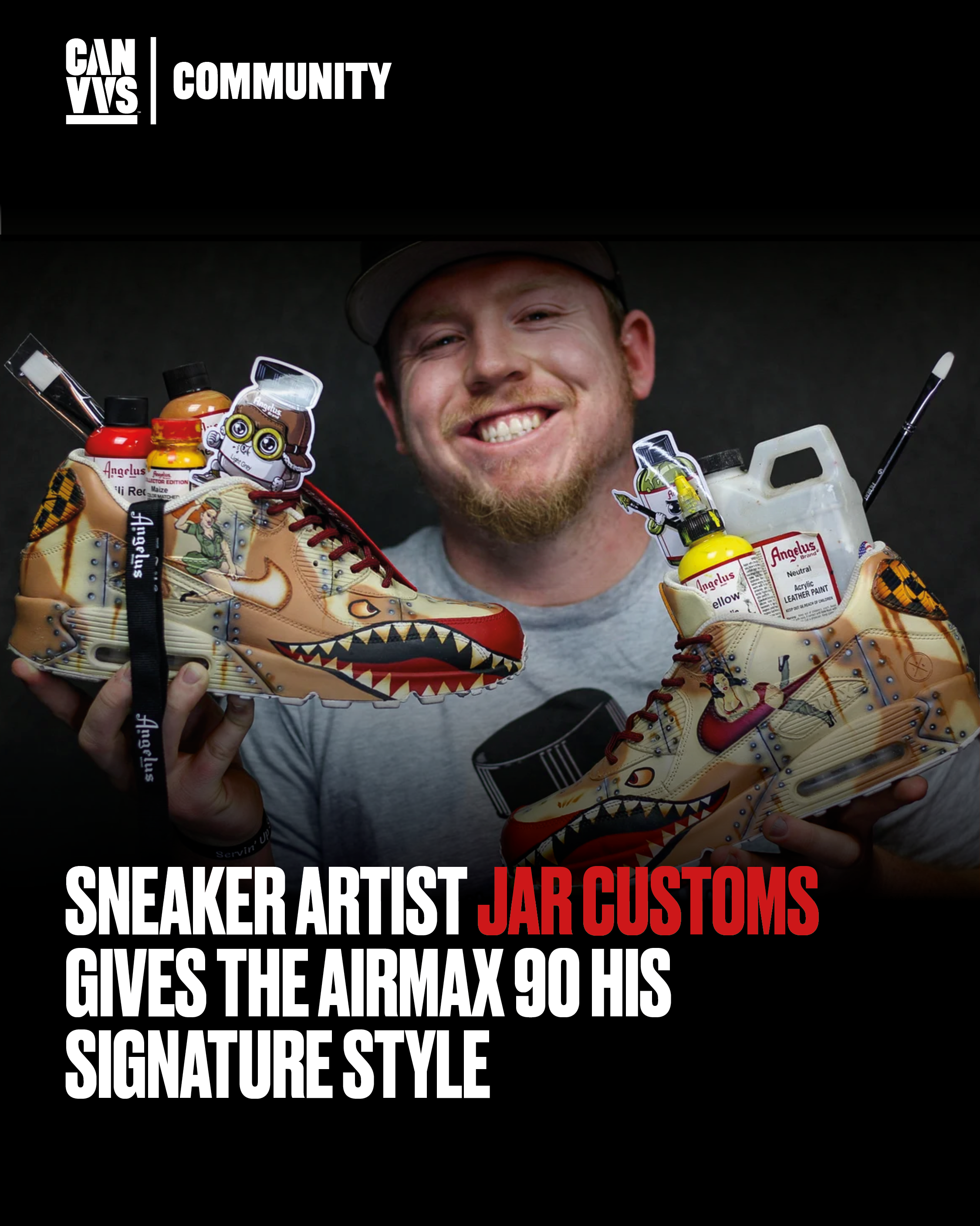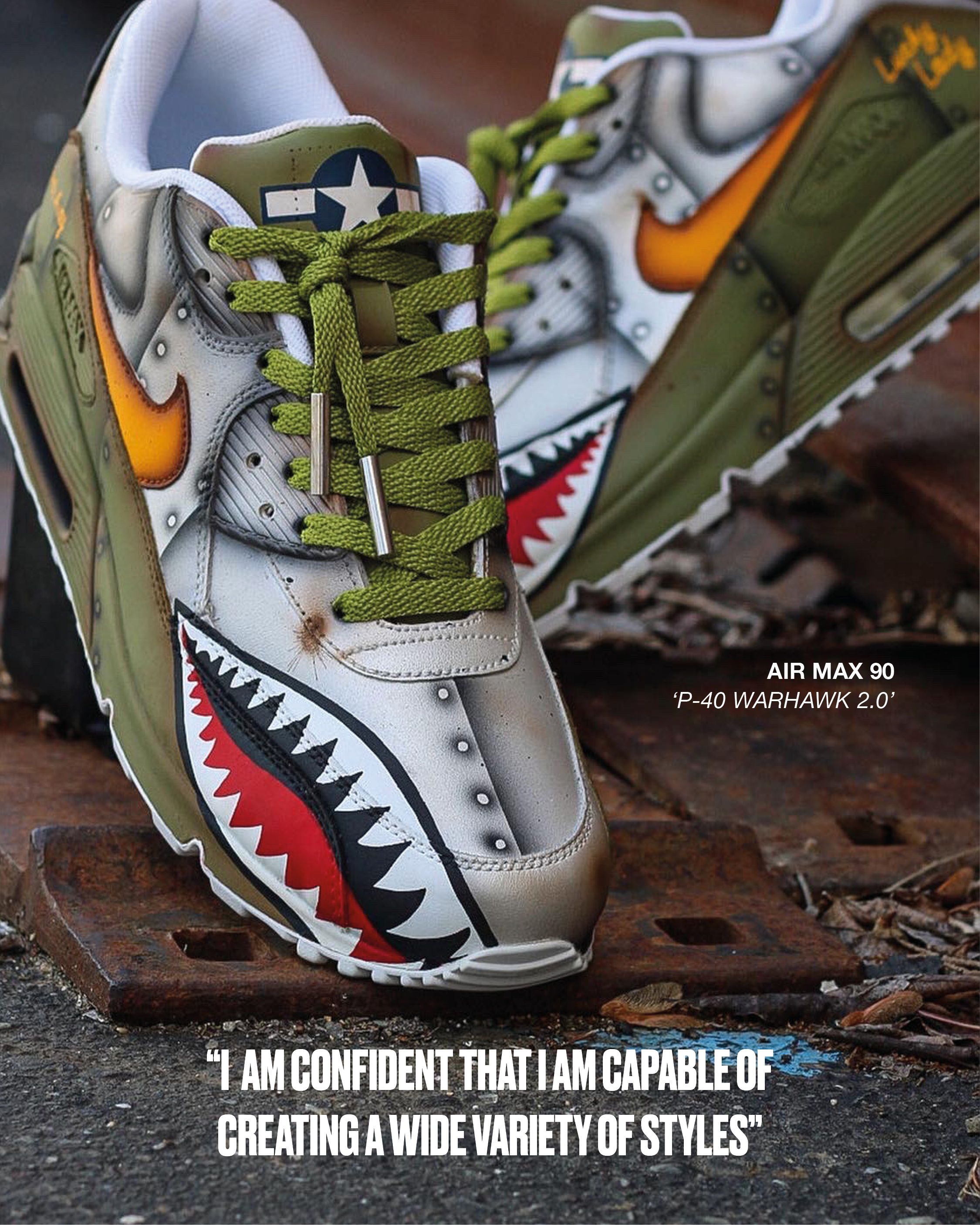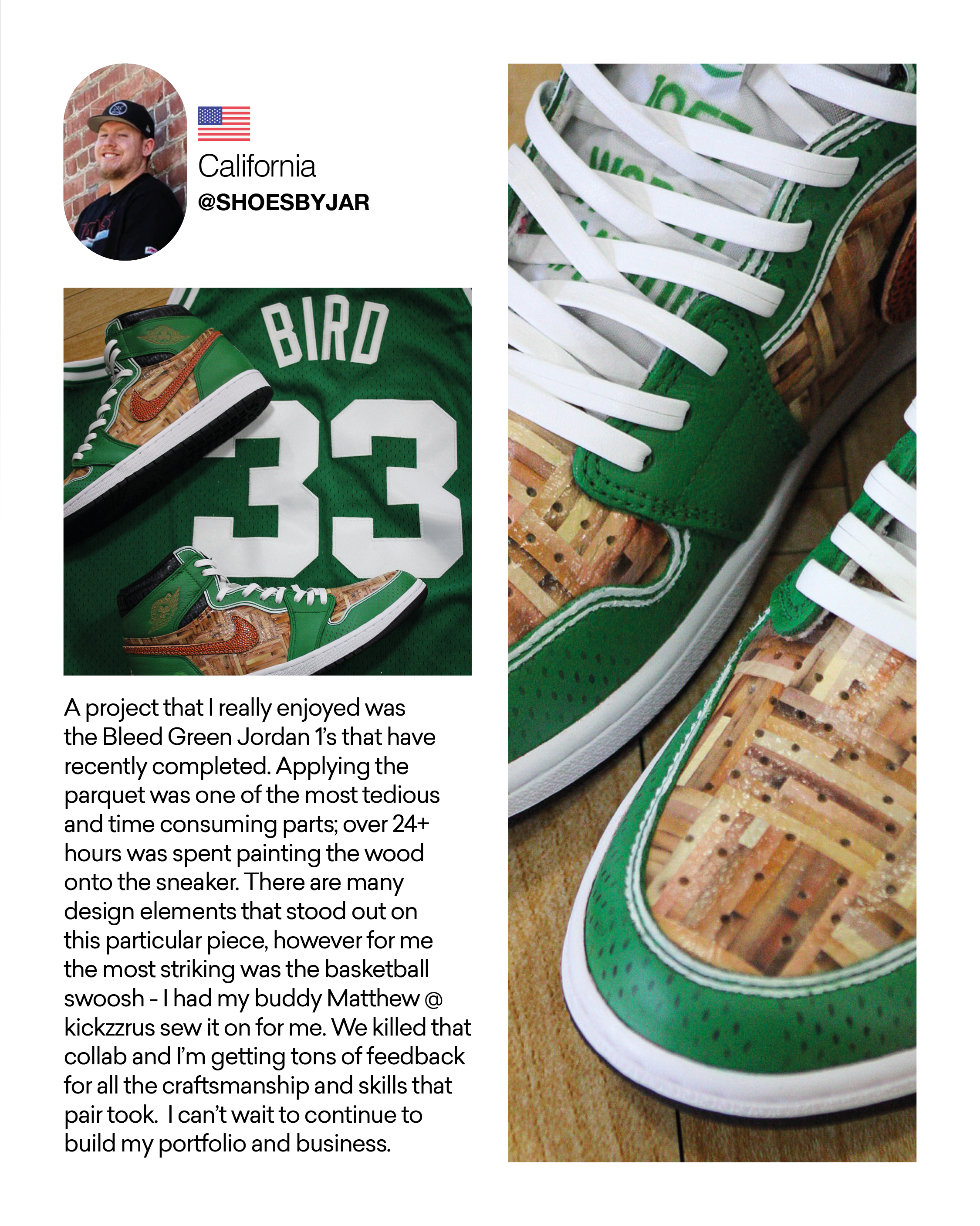Austin Torma is the man behind shoesbyjar. Starting in 2016 Austin has created over 1000 pairs of sneakers. Most of his designs pay homage to history in unique ways - like these Air Max Curtiss P-40 Warhawk 4.0 90’s. This sneaker in particular has some distinctive features including LED lights and custom tongue tags and insoles from reclusivesole. One of his favourite projects - The Bleed Green Jordan 1’s were inspired by the TD Garden where the Boston Celtics play.