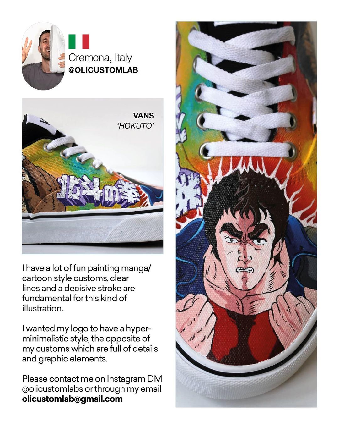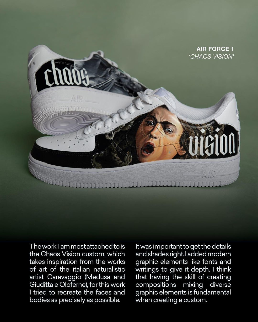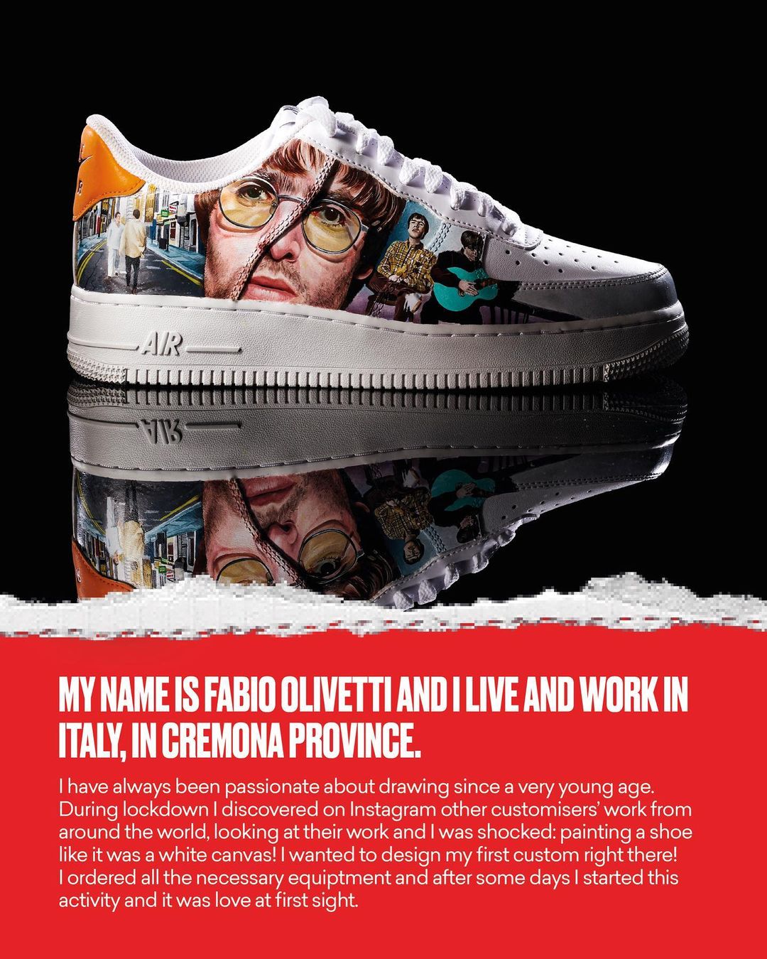 I have been passionate about drawing for many years but I was fully able to explore my skills during lockdown. Here I discovered via Instagram other customisers’ works around the world. Looking through their works I was shocked: painting a shoe like it was a white canvas is as simple as incredible. Immediatly I knew I needed to create my first custom right there! I ordered all the necessary and after some days I started this activity and it was love at first sight.