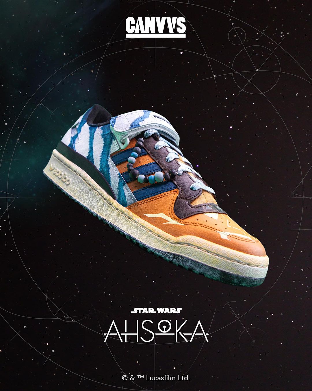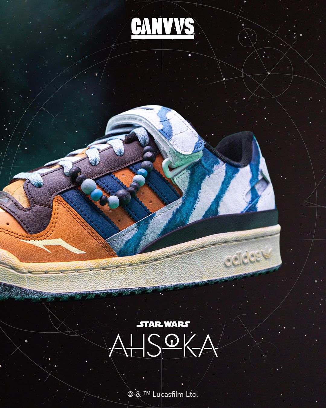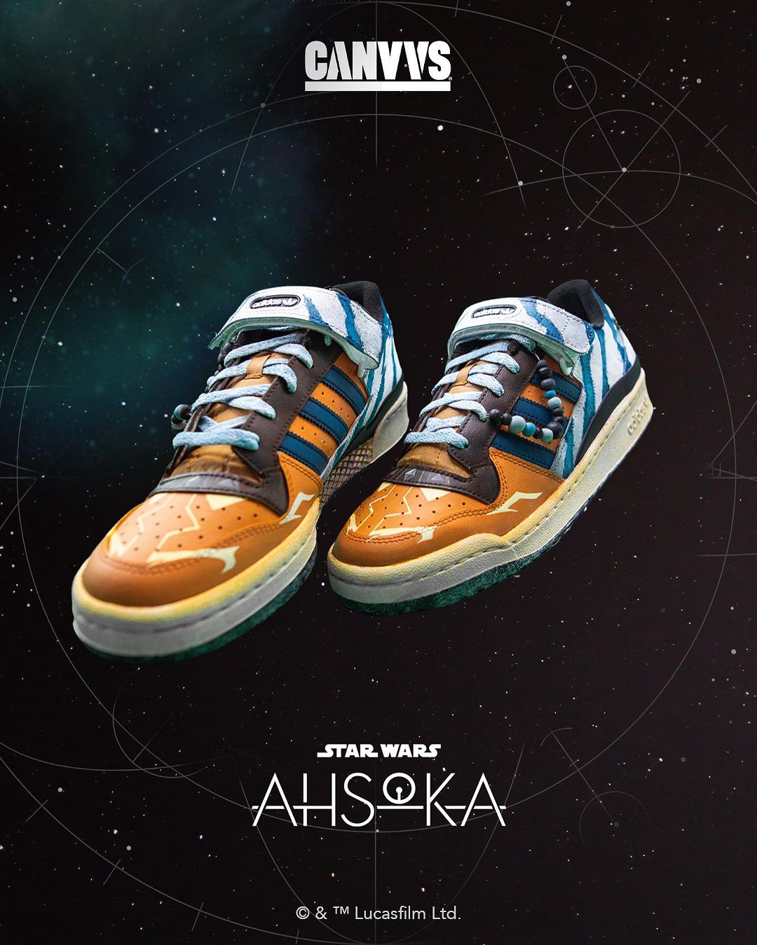 Stella set out to showcase Ahsoka’s heritage and her warrior spirit. Taking inspiration from Ahsoka’s mesmerising features, Stella replicated the Tortuga species markings on an Adidas Forum Low. The composition focused on the Montrals, personal markings and the Lekku headpiece to signify her iconic characteristics. She also added a 3D element using hanging lace charms to showcase her weapons belt - which incorporated Stella’s recognisable style.Each limited edition 1 of 1 custom sneaker has been hand painted on authentic Adidas base shoes, but is not in any way endorsed by Adidas or an official Adidas collaboration with Disney / StarWars.